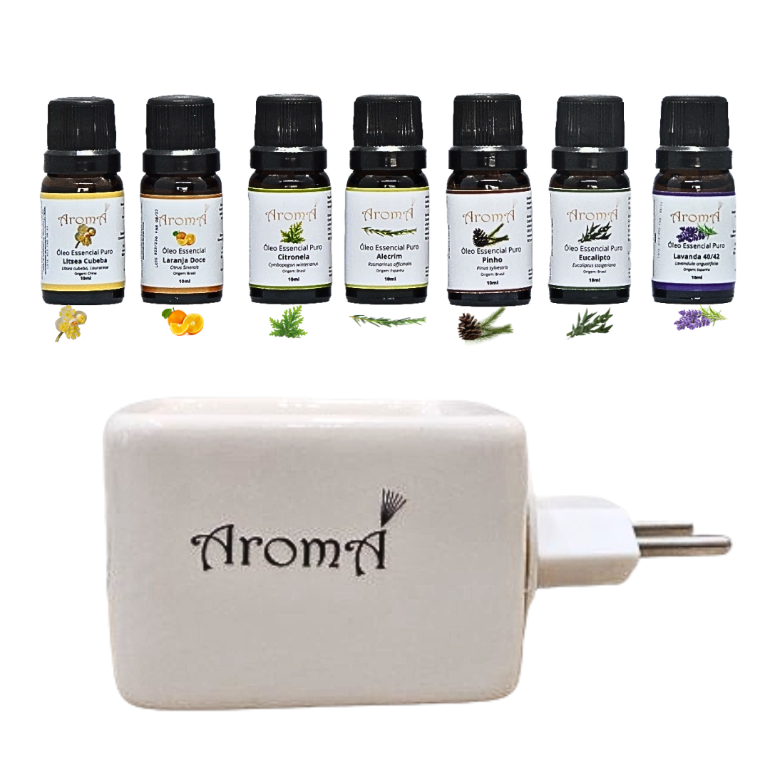 Conta com um Difusor/ Aromatizador Elétrico Bivolt de Porcelana Aromá e 7 Óleos Essenciais de 10ml cada.