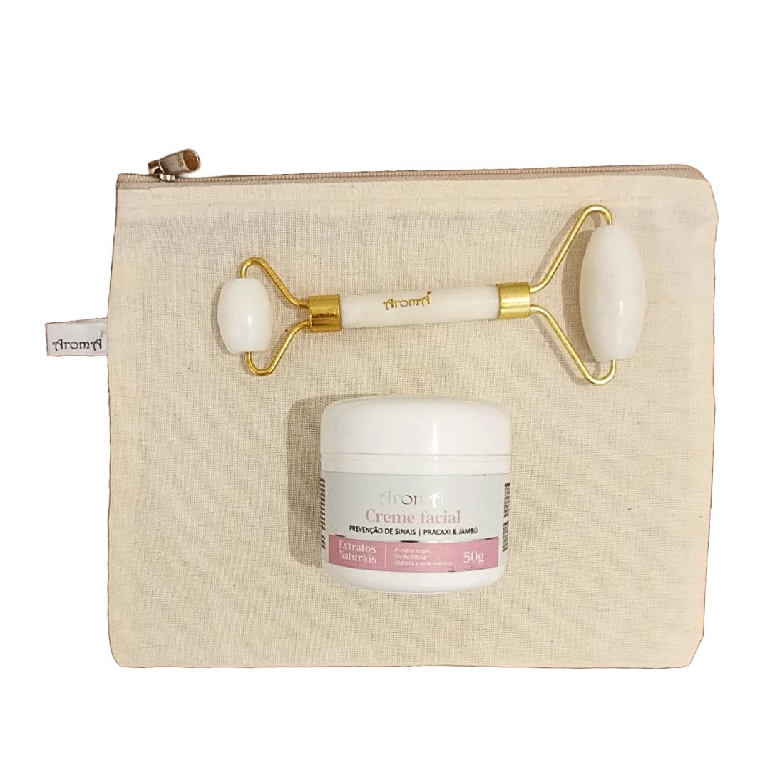 O Kit Autocuidado Facial Aromá oferece um toque de cuidado natural para sua pele, combinando um creme facial antirrugas natural e vegano com óleo essencial de palmarosa, um massageador facial de pedra e um necessaire de algodão.