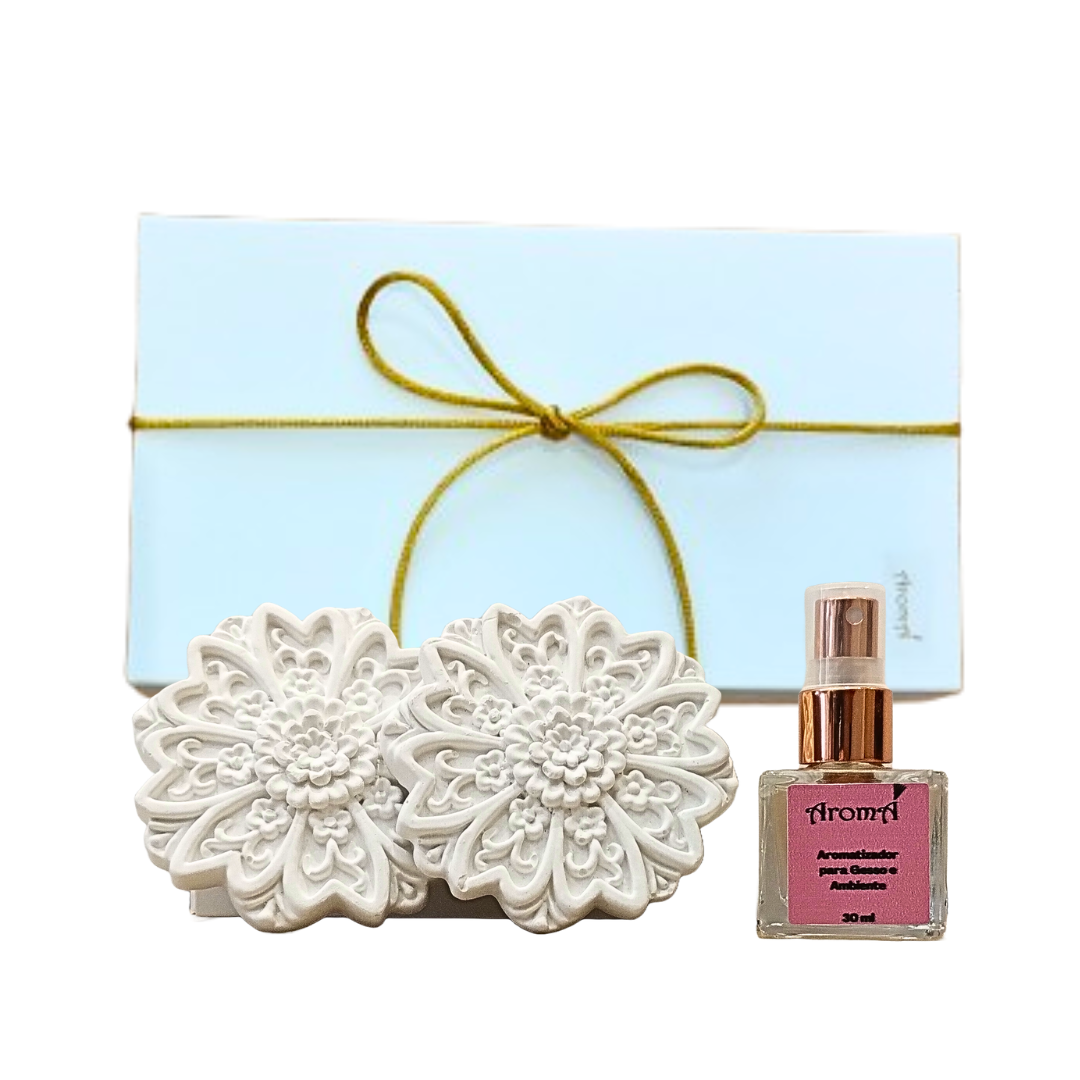 O kit Floratta da Aromá é uma excelente opção para presentear, acompanha 2 gessos grandes e um aromatizador concentrado premium fragrância exclusiva floral Frutal, embalados numa caixa tipo gaveta presenteável.