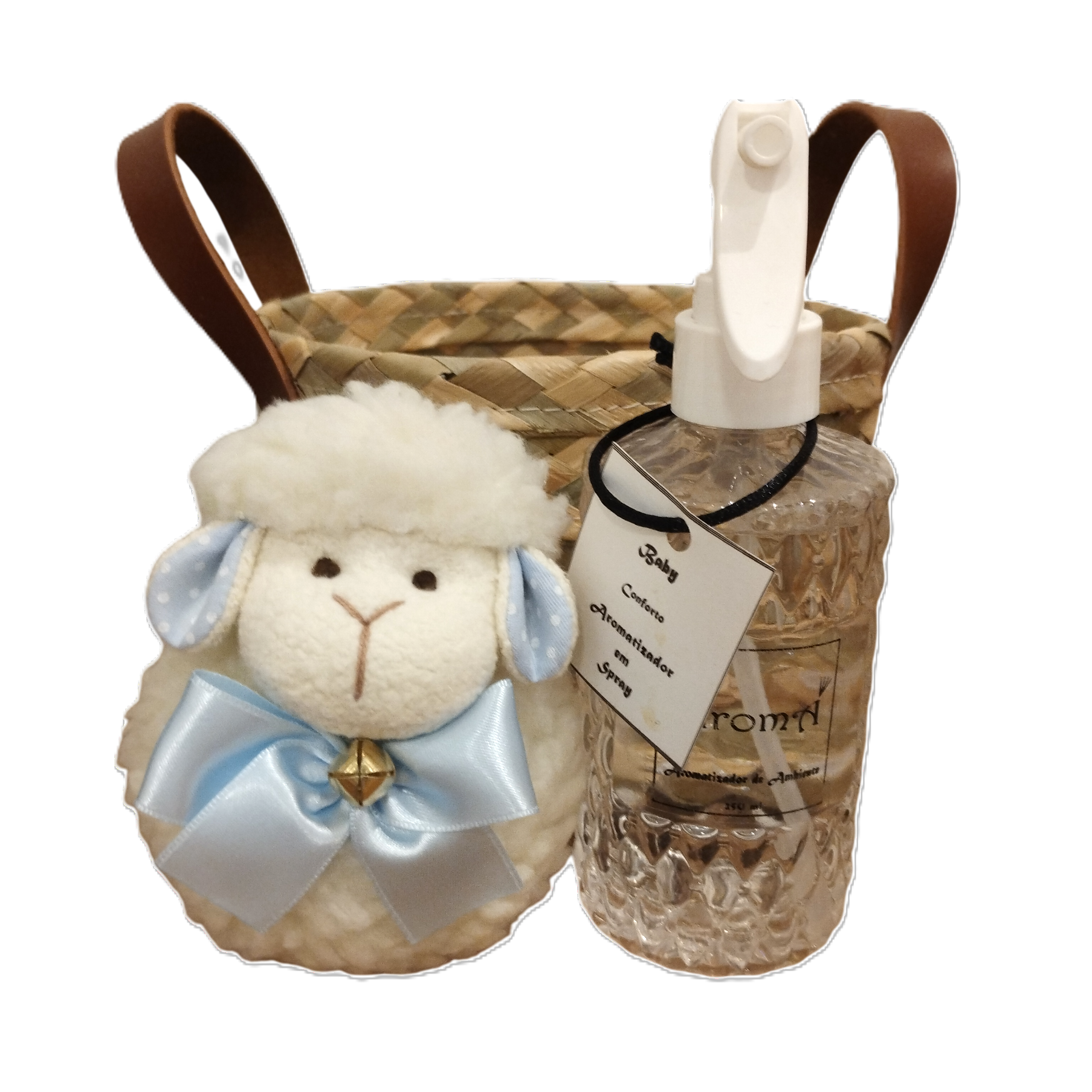 Ele conta com um aromatizador spray fragrância delicada Baby exclusiva da Aromá, uma ovelhinha graciosa artesanal feita com todo carinho com laço azul claro e um sininho que emite um som de sininho real, proporcionando um charme especial. O kit vem acomodado em uma cesta artesanal feita de carnaúba brasileira, que garante um toque natural e rústico, perfeito para presentear ou decorar o quarto da bebê com estilo.